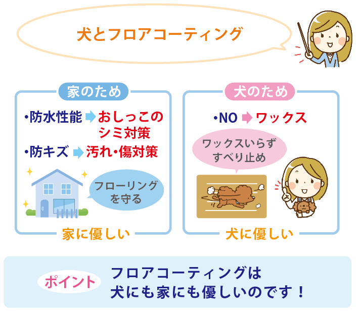 また、フロアコーティングは滑らないので安全性も高く犬の怪我防止に最適です。愛犬と飼い主が心地よく生活できるためのポイントを紹介しています。