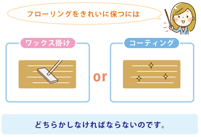 フロアコーティングは絶対に必要かと聞かれるとフロアコーティングをしなくても問題ありませんが、2~3ヶ月に1回ワックスを掛けるなど定期的にメンテナンスしなければなりません。