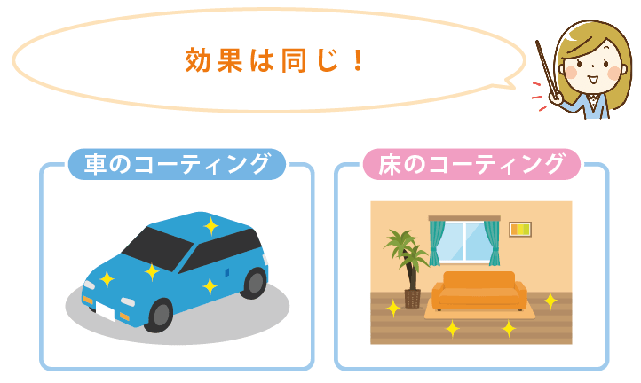 フロアコーティングは、車に施工するボディーコーティングのようなものです。ボディーコーティングをすると、車のボディを汚れや傷から守ってくれて塗装の輝きを維持します。