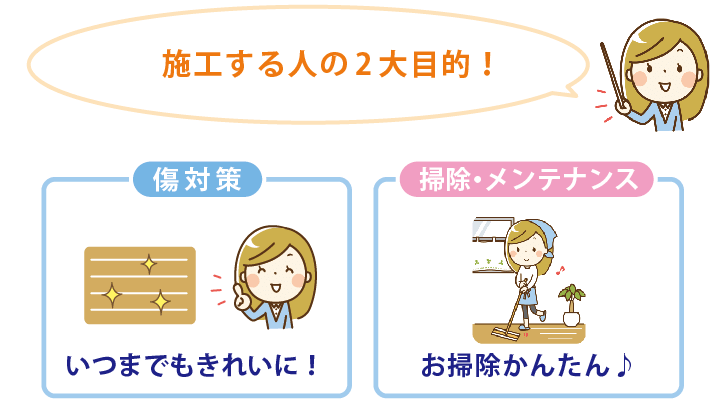 フロアコーティングを施工する目的で一番多いのが、傷防止対策と掃除やメンテナンスが楽になることの2つです。