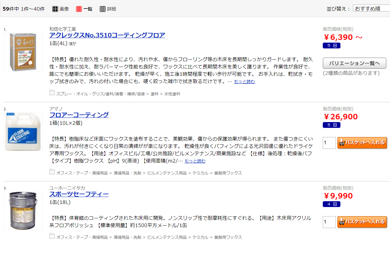 床用コーティング一覧で出てきた商品はフロアコーティングと書いてありますが、殆どがワックスです。