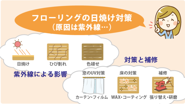 フローリングが日に焼けてしまって、周りと床の色が変わってしまった経験はありませんか?床の日焼け対策を行わないと劣化が進行します。