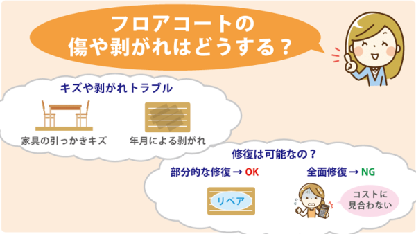 フロアコーティングが剥離してしまった時やコーティング面に傷がついてしまった時には補修修繕ができるのでしょうか。ここでは、補修の場合の対策、自分で直す場合の手順について紹介しています!