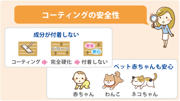 | シリコンコーティング | ◯10年以上 | 天然素材で美しい光沢 | 低 | ペット、赤ちゃん |