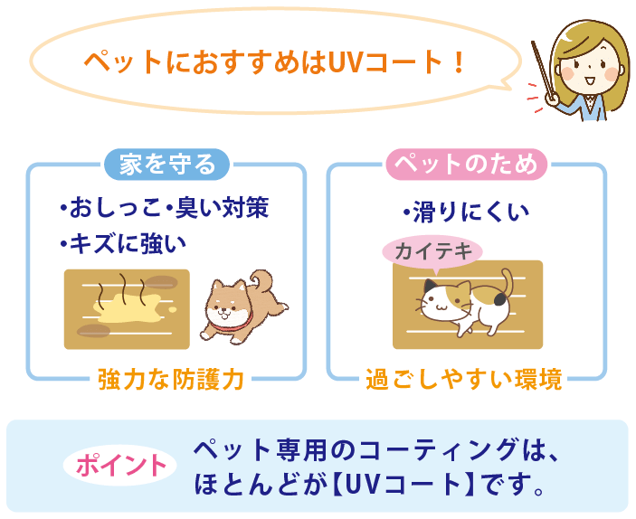ペットに最適なフロアコートの種類はUVコートがおすすめです。