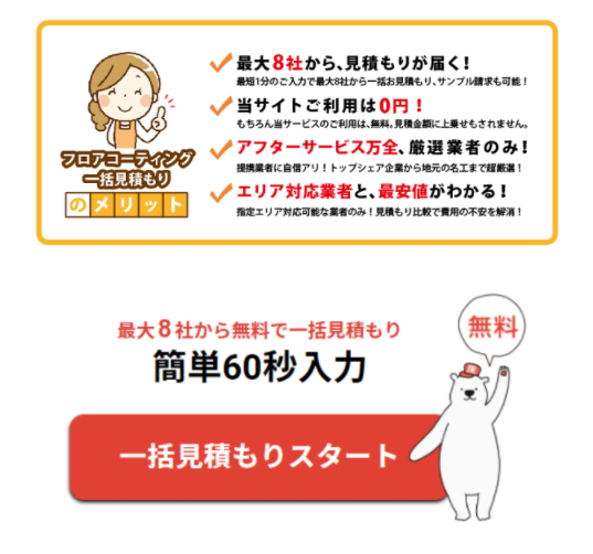 予算が高いと感じる場合はフロアコーティング業者の無料一括見積もりを利用して安い業者を見つけるのも一つの手です。