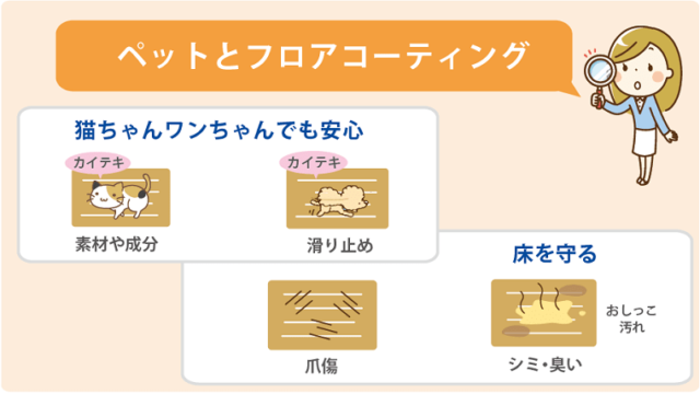 ペットが舐めても安心素材のペット用フロアコーティングや滑りにくいペット用フロアコーティングなどがあるので快適に過ごせるペット用フロアコーティングを選ぶことがまず第一ですね。