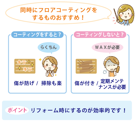 とはいえ、住みながら定期的なワックスがけは結構大変なものですので、フローリングを張り替えたタイミングでお手入れが楽なフロアコーティングをしてしまうのも良いかもしれません。